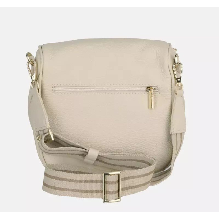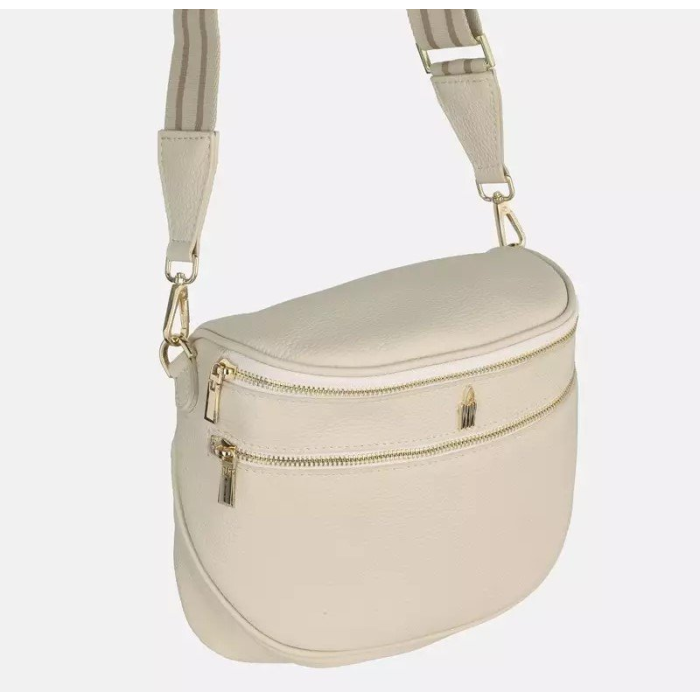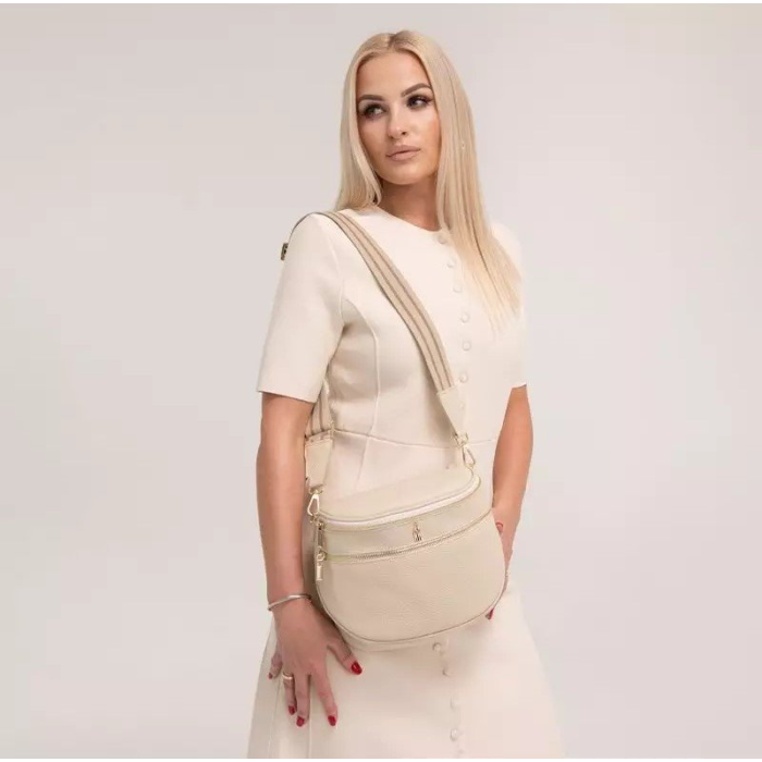Elegantná béžová crossbody kabelka z pravej kože talianskej so zlatým kovaním. Praktická veľkosť, viacero vreciek a nastaviteľný popruh z nej robia ideálnu kabelku na každý deň.