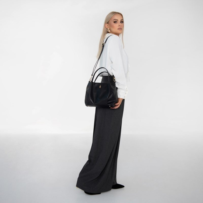 Čierna kožená kabelka z pravej hladkej kože je nadčasovým módnym doplnkom, ktorý sa perfektne hodí do každého šatníka. Jej elegantný čierny odtieň pôsobí luxusne a univerzálne, ľahko ladí s tmavými aj svetlými outfitmi a dodá každému looku sofistikovaný charakter.