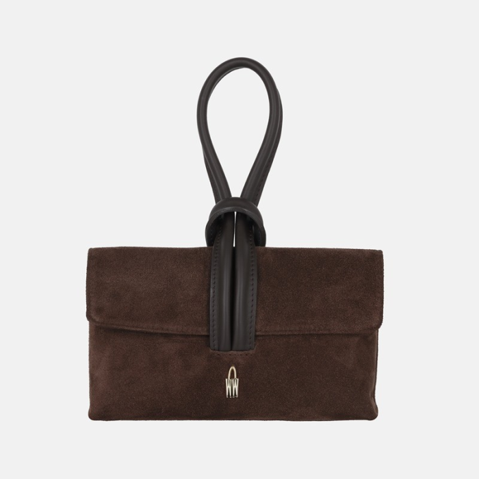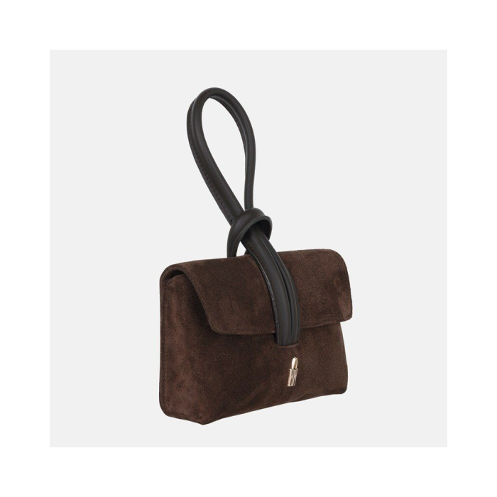 Tmavo hnedá semišová kabelka z pravej talianskej kože so zlatým kovaním. Elegantný kompaktný model do ruky vhodný na mestské aj spoločenské príležitosti.