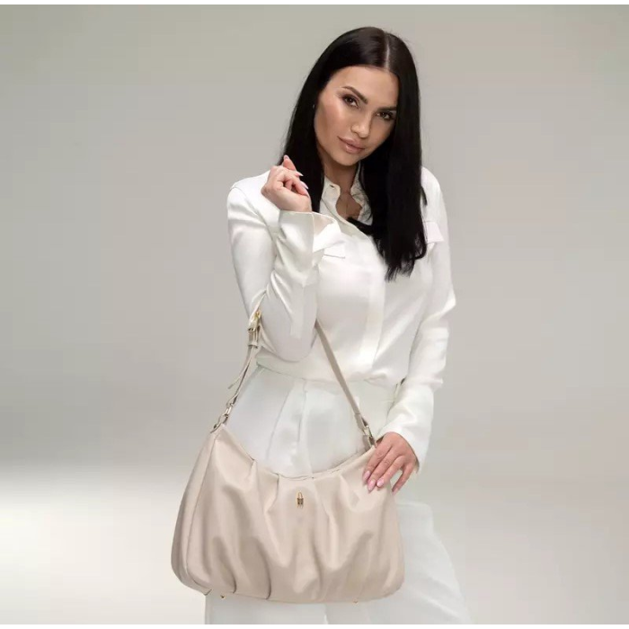 Svetlá béžová kožená kabelka je ideálnou voľbou k nohaviciam, šatám, sukniam aj rifliam. Vhodne doplní elegantný aj smart-casual štýl.