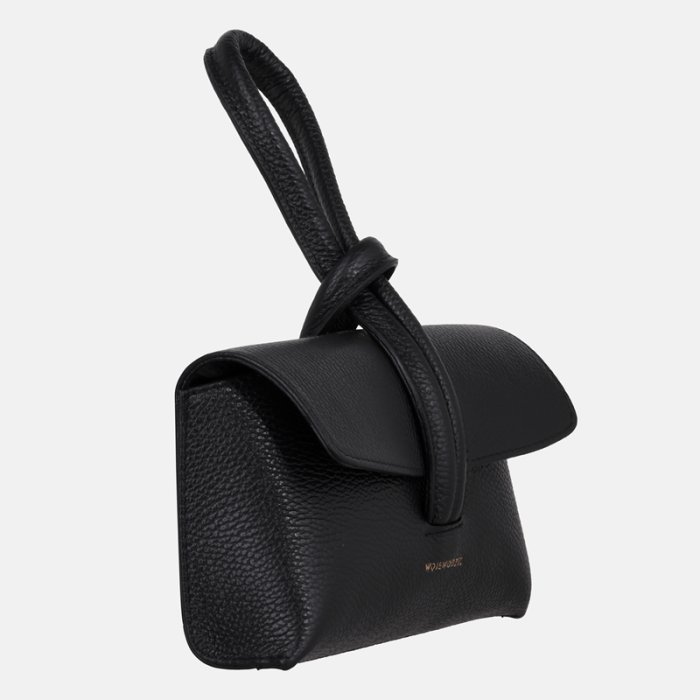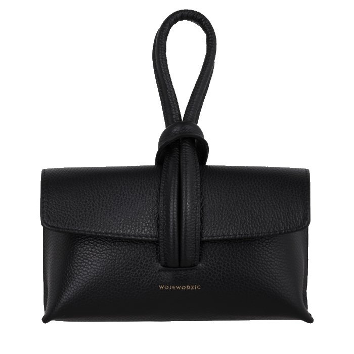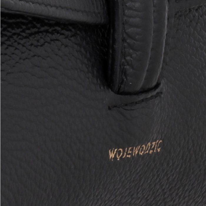 Čierna kožená kabelka z hrudkovitej kože vysokej talianskej kvality so zlatým logom Wojewodzic. Elegantný kompaktný model do ruky vhodný na každodenné aj spoločenské príležitosti.