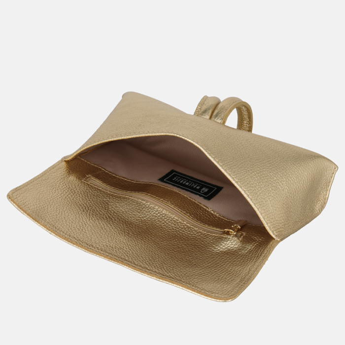 Zlatá metalická kabelka z hrudkovitej kože so zlatým kovaním. Elegantný malý model do ruky vhodný na večerné a spoločenské príležitosti.