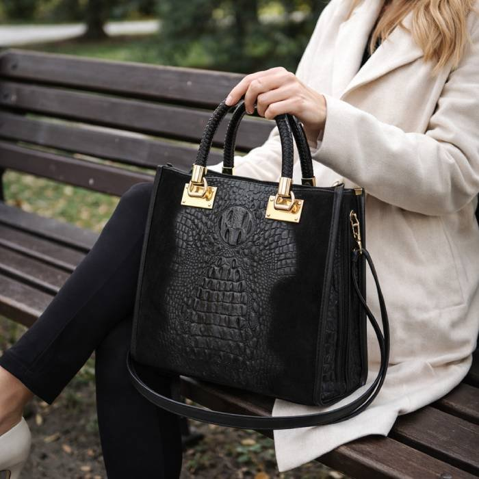Táto dámska talianska kabelka je vyrobená z kvalitnej pravej kože v kombinácii čierneho semišu a lakovaného krokodílieho vzoru, ktorý tvorí dominantný stredový detail. Kontrast matného a lesklého povrchu dodáva kabelke luxusný a vyvážený vzhľad.