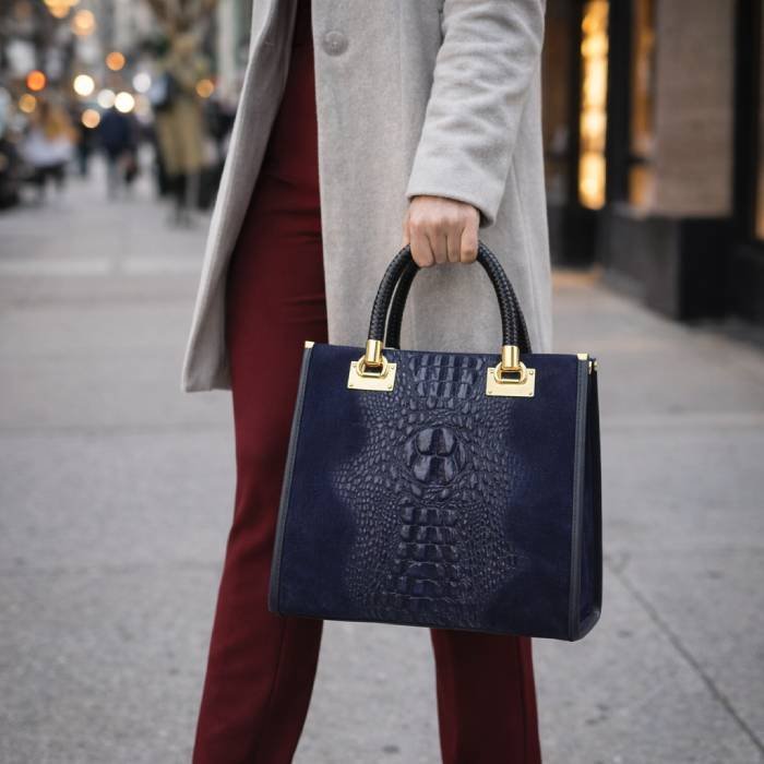 Elegantná pracovná kabelka z tmavomodrého semišu s lakovaným krokodílím stredom. Drží pevný tvar, pojme dokumenty A4 a pôsobí profesionálne aj pri každodennom nosení. Kabelka je aktuálne skladom a pripravená na okamžité odoslanie.