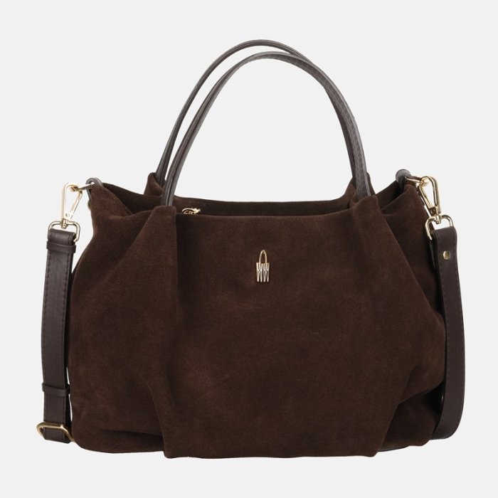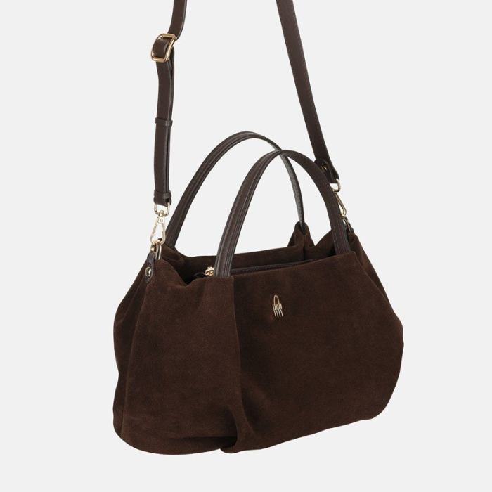 Tmavo hnedá semišová kabelka z pravej kože je elegantný a nadčasový doplnok so zlatým kovaním. Má zapínanie na zips, nastaviteľné ramienko (max. 120 cm), jednu hlavnú komoru a tri vnútorné vrecká na zips. Kompaktný mestský model vhodný do práce aj na stretnutia (A4 sa do nej nezmestí).