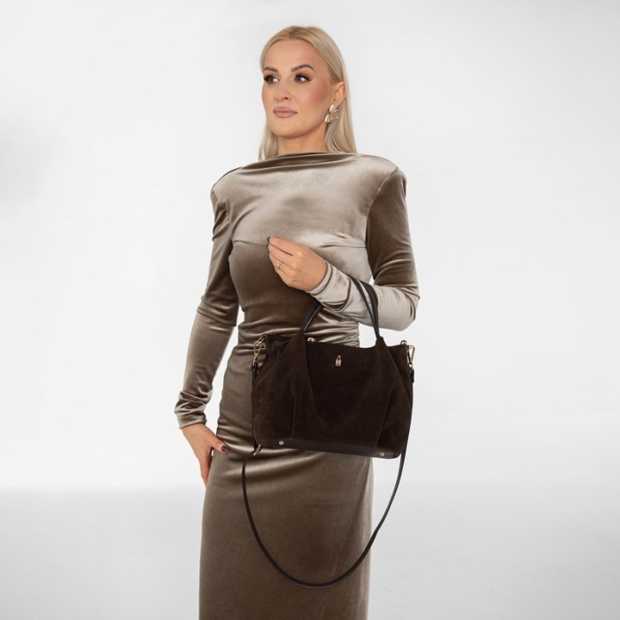 Tmavo hnedá kožená kabelka zo semišu – elegantná voľba 2026